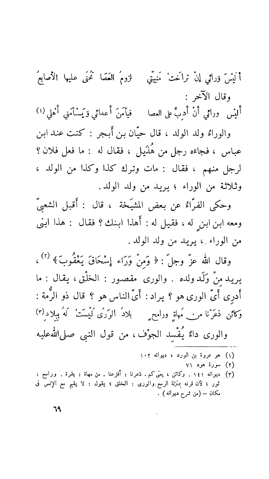وحكى الفَرَّاءُ عن بعض المشيَخة، قال: أَقبل الشَّعبيّ ومعه ابن ابنٍ له، فقيل: أَهذا ابنك؟ فقال: هذا ابني من الوَراء، يريد من ولد الولد.