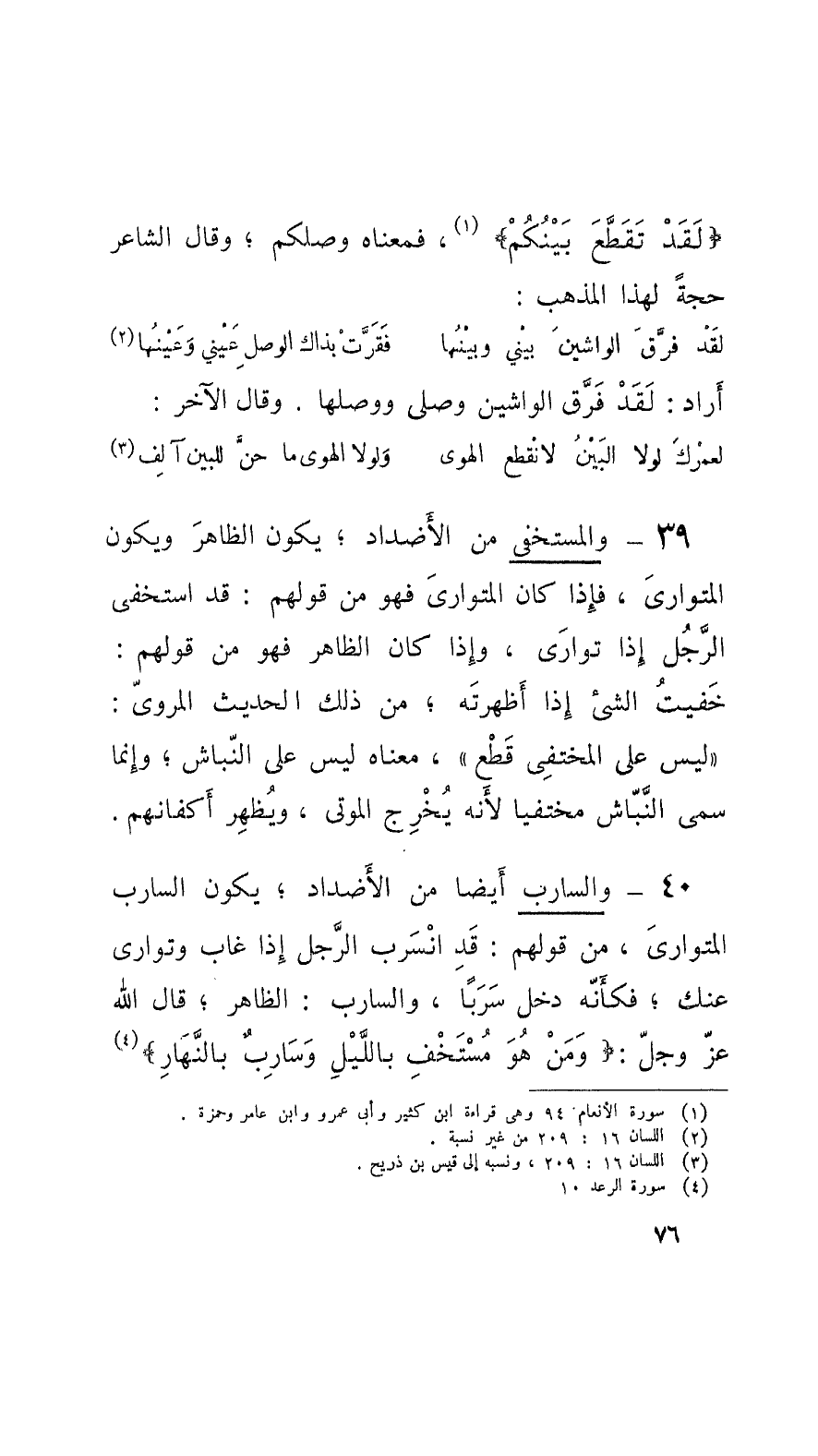 40 - والسارب أَيْضاً من الأَضْداد، يكون السارب المتواريَ، من قولهم: قَدِ انْسَرَب الرَّجل إِذا غاب وتوارى عنك؛ فكأَنَّه دخل سَرَباً، والسارب: الظاهر؛ قال الله عزَ وجلّ: وَمَنْ هُوَ مُسْتَخْفِ باللَّيْلِ وَسَرِبٌ بالنَّهارِ