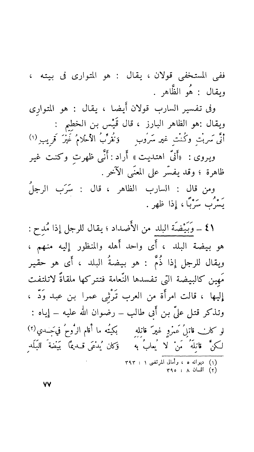 41 - وبَيْضَة البلد كم الأَضْداد؛ يقال للرَّجل إِذا مُدِح: هو بيضة البلد، أَي أَهله والمنظور إِلَيْه منهم، ويقال للرَّجل إِذا ذُمَّ: هو بيضةُ البلد، أَي هو حقير مَهِين كالبيضة التي تفسدها النَّعامة فتتركها ملقاةً لا تلتفت إِليها، قالت امرأَةٌ من العرب تَرْثِي عمراً بن عبد وَدّ، وتذكر قتل عليّ بن أَبي طالب - رضوان الله عليه - إِيَّاه: