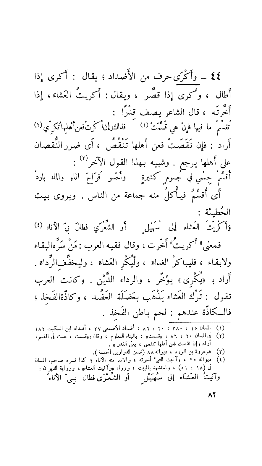 44 - وأَكْرَى حرف من الأَضْداد؛ يقال: أَكْرى إِذا أَطال، وأَكْرى إِذا قصَّر، ويقال: أَكْريتُ العَشاءَ، إِذا أَخَّرتَه، قال الشَّاعر يَصِفُ قِدْراً: