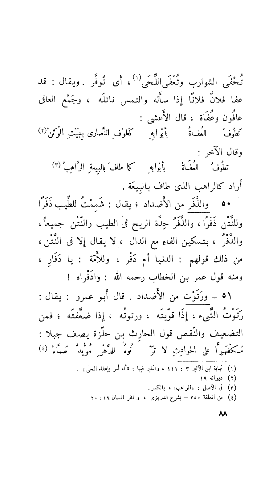 50 - والذَّفَر من الأَضْداد؛ يقال: شَمِمْتُ للطِّيب ذَفَراً والنَّتْن ذَفَراً، والذَّفَرُ حِدَّة الريح في الطيب والنّتْن جميعاً، والدَّفْرُ، بتسكين الفاء مع الدال، لا يقال إِلاَّ في النَّتْن، من ذلك قولهم: الدنيا أَم دَفْر، وللأَمَة: يا دَفَارِ، ومنه قول عمر بن الخطاب رحمه الله: وادَفْراه!