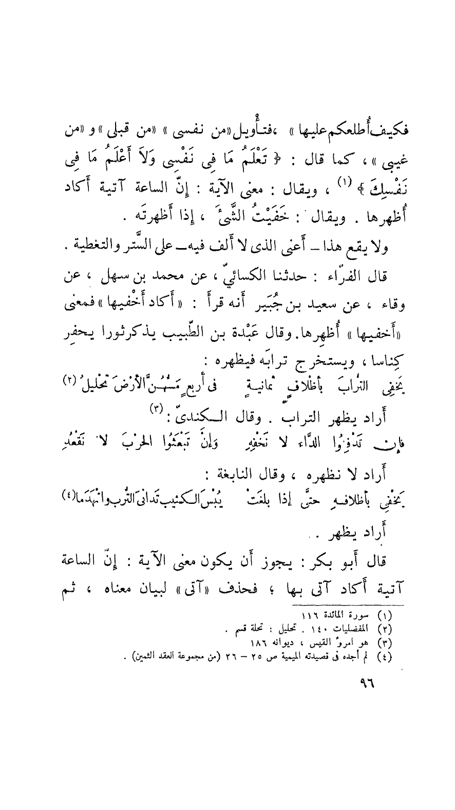 قال الفَرَّاءُ: حدَّثنا الكِسَائِيّ، عن محمد بن سهل، عن وقاء، عن سعيد بن جُبَيْر أَنَّهُ قرأَ: أَكاد أَخْفيها، فمعنى أَخفيها أُظهرِها. وقالَ عَبْدة بن الطَّبيب يذكر ثوراً يحفِر كِناساً، ويستخرج ترابَه فيظهره: