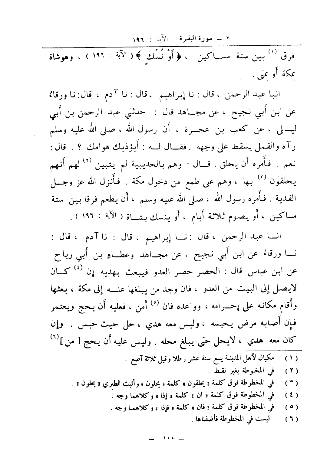 انبا عبد الرحمن قال نا إبراهيم قال نا آدم قال نا ورقاء عن ابن أبي نجيح عن مجاهد قال حدثني عبد الرحمن بن أبي ليلى عن كعب بن عجرة أن رسول الله صلى الله عليه و سلم رآه والقمل يسقط على وجهه فقال له أيؤذيك هوامك قال نعم فأمره أن يحلق قال وهم بالحديبية لم يتبين لهم أنهم يحلقون بها وهم على طمع من دخول مكة فأنزل الله عز و جل الفدية فأمره رسول الله صلى الله عليه و سلم أن يطعم فرقا بين ستة مساكين أو يصوم ثلاثة أيام أو ينسك بشاة
