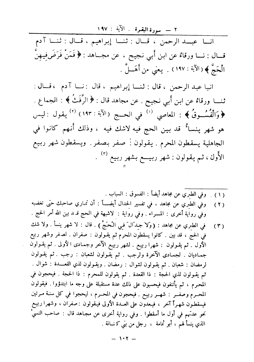 انبا عبد الرحمن قال ثنا إبراهيم قال نا آدم قال ثنا ورقاء عن ابن أبي نجيح عن مجاهد قال الرفث الجماع والفسوق المعاصي في الحج يقول ليس هو شهر ينسأ قد بين الحج فيه ولا شك فيه وذلك أنهم كانوا في الجاهلية يسقطون المحرم يقولون صفر بصفر ويسقطون شهر ربيع الأول ثم يقولون شهر ربيع بشهر ربيع