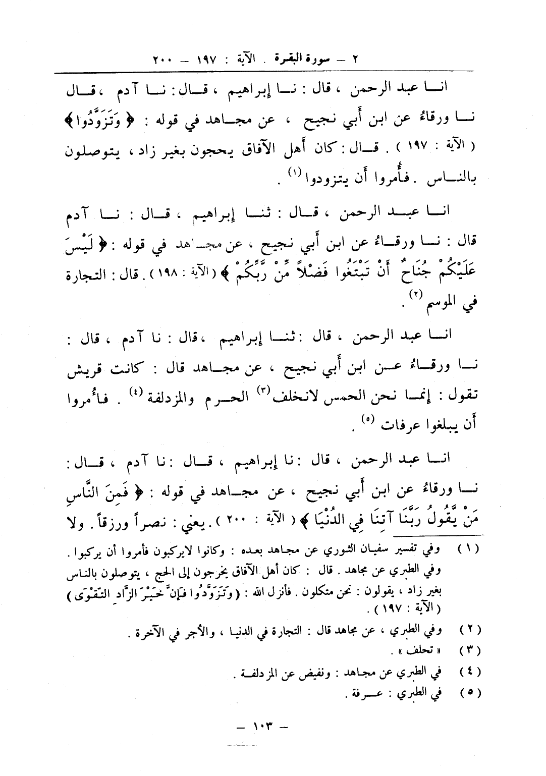 انا عبد الرحمن قال نا إبراهيم قال نا آدم قال نا ورقاء عن ابن أبي نجيح عن مجاهد في قوله وتزودوا قال كان أهل الآفاق يحجون بغير زاد يتوصلون بالناس فأمروا أن يتزودوا