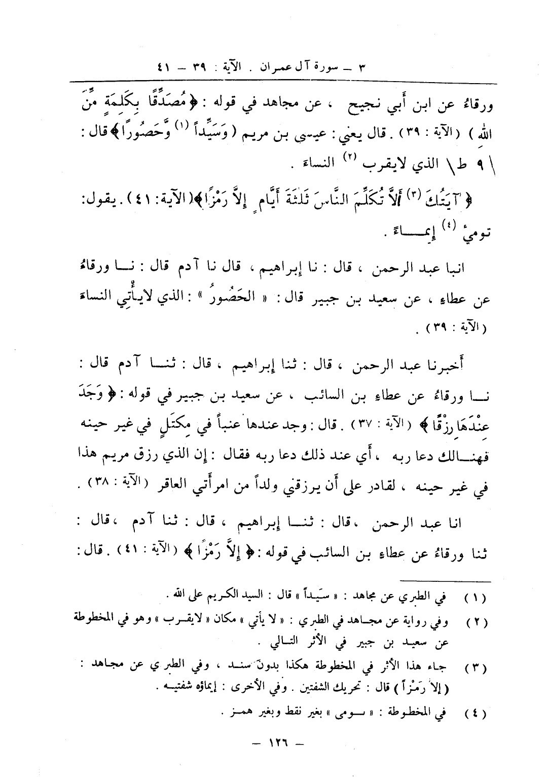 ورقاء عن ابن أبي نجيح عن مجاهد في قوله مصدقا بكلمة من الله قال يعني عيسى بن مريم وسيدا وحصورا قال الذي لا يقرب النساء آيتك ألا تكلم الناس ثلثة أيام إلا رمزا يقول توميء إيماء