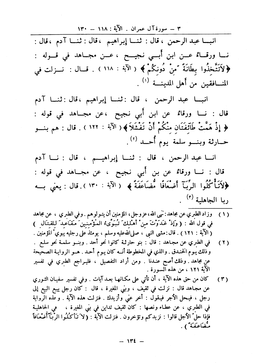 انا عبد الرحمن قال ثنا إبراهيم قال نا آدم قال نا ورقاء عن ابن أبي نجيح عن مجاهد في قوله لا تأكلوا الربآ أضعافا مضاعفة قال يعني به ربا الجاهلية