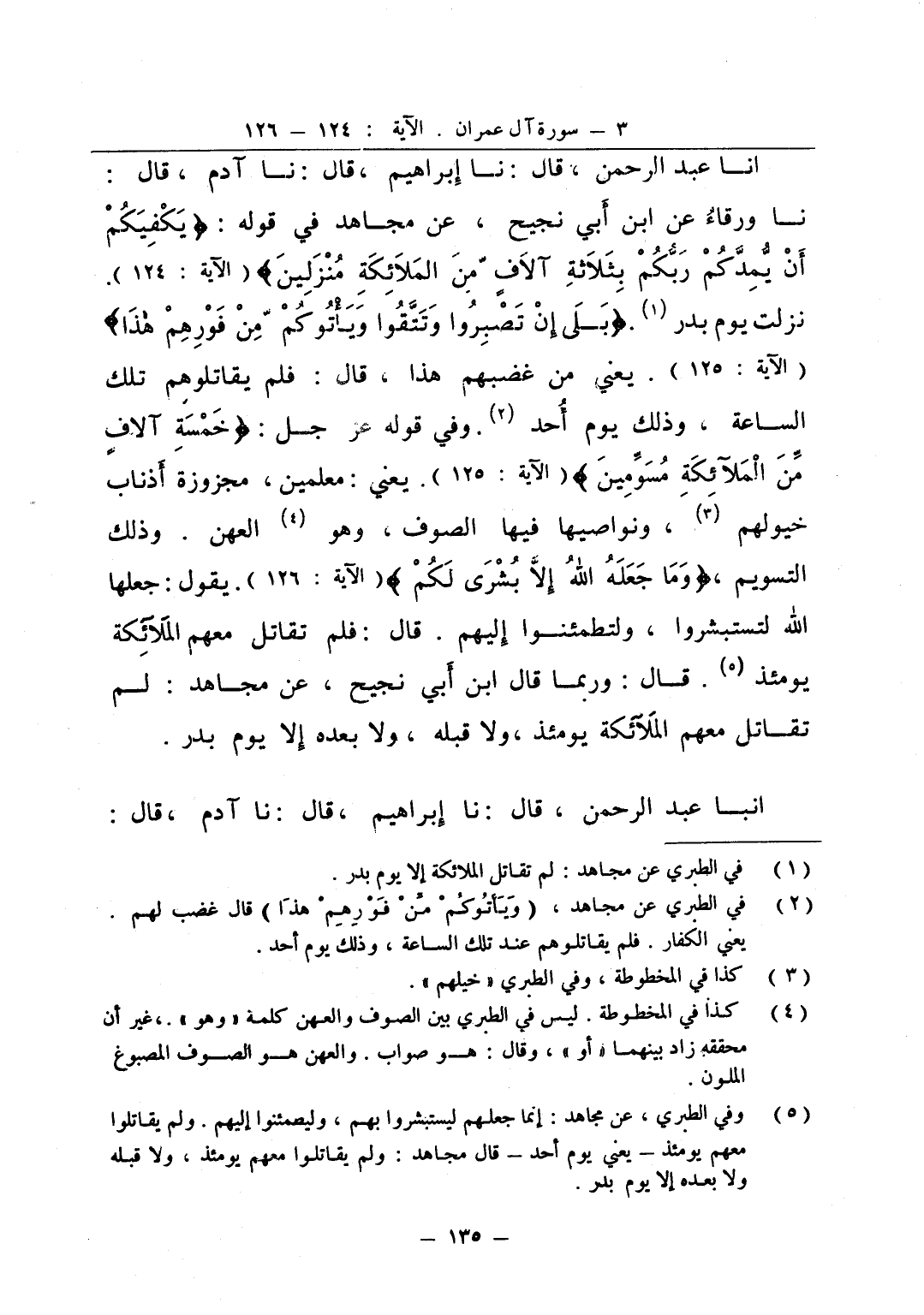 انا عبد الرحمن قال نا إبراهيم قال نا آدم قال نا ورقاء عن ابن أبي نجيح عن مجاهد في قوله يكفيكم أن يمدكم ربكم بثلاثة آلاف من الملائكة منزلين نزلت يوم بدر بلى إن تصبروا وتتقوا ويأتوكم من فورهم هذا يعني من غضبهم هذا قال فلم يقاتلوهم تلك الساعة وذلك يوم أحد وفي قوله عز و جل خمسة آلاف من الملائكة مسومين يعني معلمين مجزوزة أذناب خيولهم ونواصيها فيها الصوف وهو العهن وذلك التسويم وما جعله الله إلا بشرى لكم يقول جعلها الله لتستبشروا ولتطمئنوا إليهم قال فلم تقاتل معهم الملائكة يومئذ قال وربما قال ابن أبي نجيح عن مجاهد لم تقاتل معهم الملائكة يومئذ ولا قبله ولا بعده إلا يوم بدر