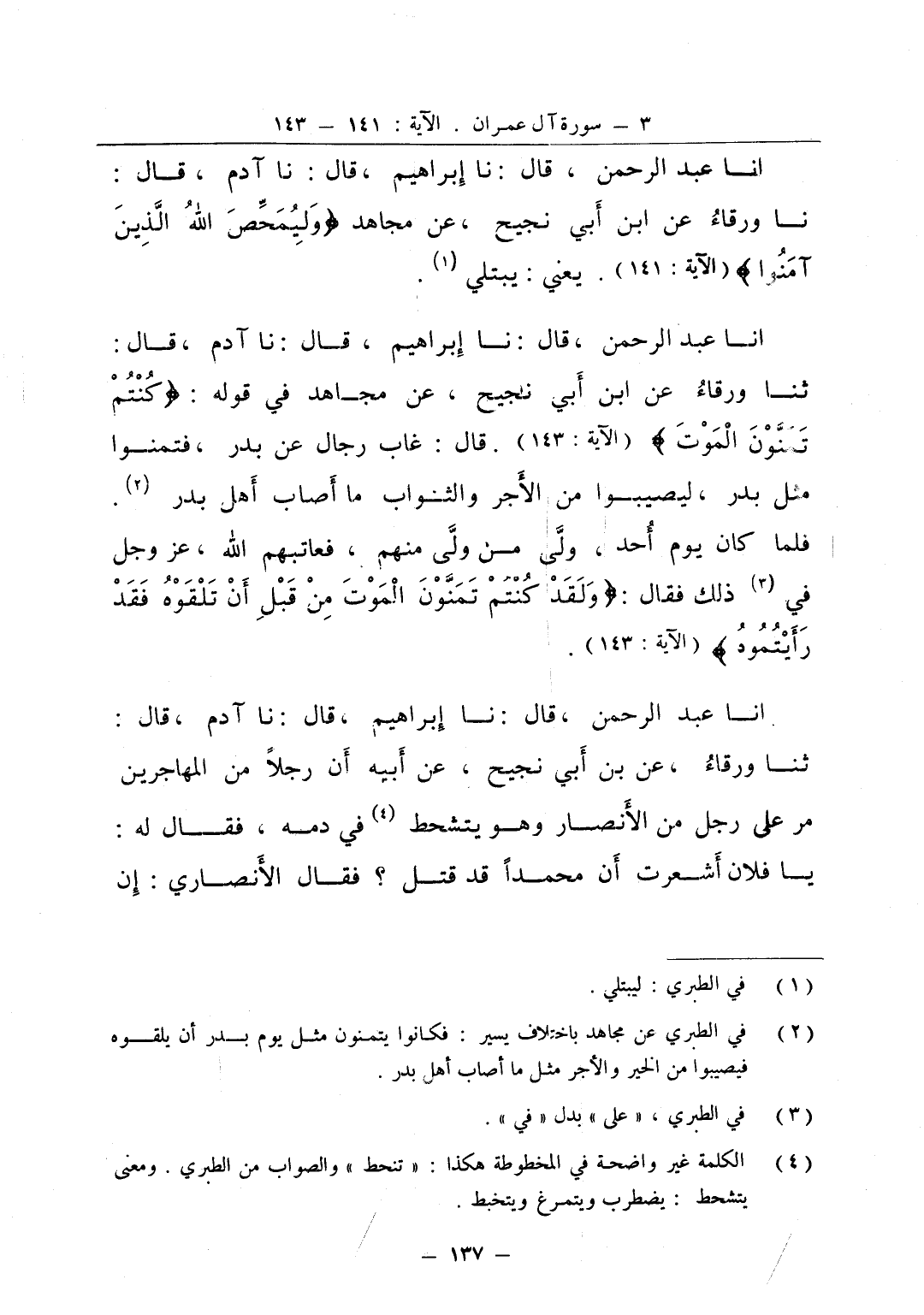 انا عبد الرحمن قال نا إبراهيم قال نا آدم قال نا ورقاء عن ابن أبي نجيح عن مجاهد وليمحص الله الذين آمنوا يعني يبتلي