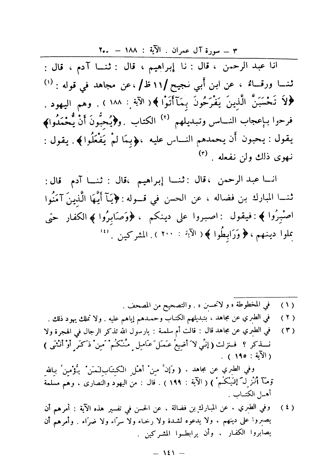 انا عبد الرحمن قال نا إبراهيم قال ثنا آدم قال ثنا ورقاء عن ابن أبي نجيح عن مجاهد في قوله لا تحسبن الذين يفرحون بما أتوا وهم اليهود فرحوا بإعجاب الناس وتبديلهم الكتاب ويحبون أن يحمدوا يقول يحبون أن يحمدهم الناس عليه بما لم يفعلوا يقول نهوى ذلك ولن نفعله
