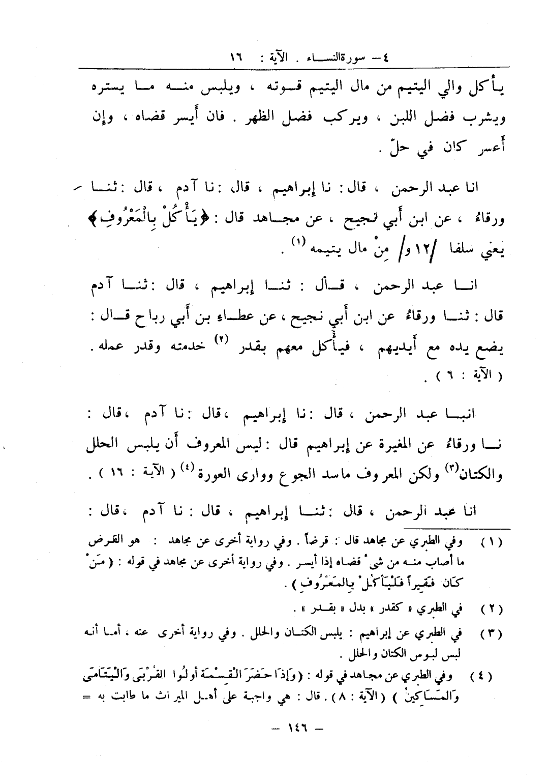 انا عبد الرحمن قال نا إبراهيم قال نا آدم قال ثنا ورقاء عن ابن ابي نجيح عن مجاهد قال يأكل بالمعروف يعنى سلفا من مال يتيمه أنا عبد الرحمن قال ثنا إبراهيم قال ثنا آدم قال ثنا ورقاء عن ابن أبي رباح قال يضع يده مع أيديهم فيأكل معهم بقدر خدمته وقدر عمله