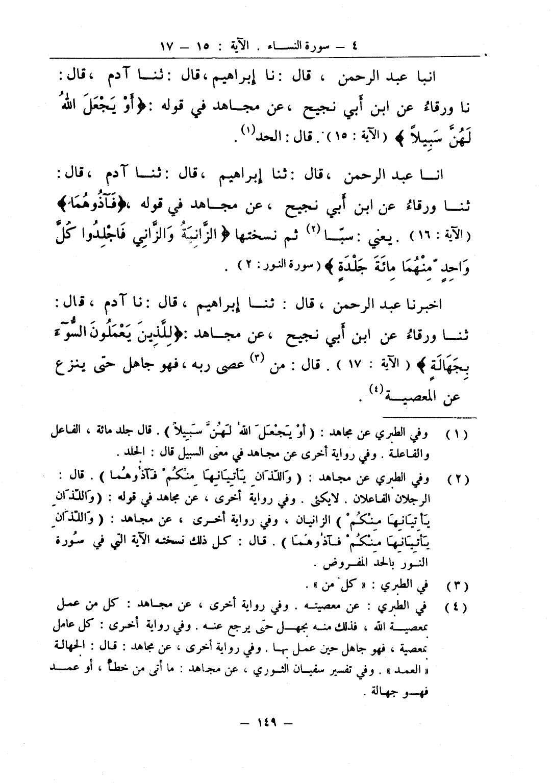 انبا عبد الرحمن قال نا إبراهيم قال ثنا آدم قال نا ورقاء عن ابن أبي نجيح عن مجاهد في قوله أو يجعل الله لهن سبيلا قال الحد