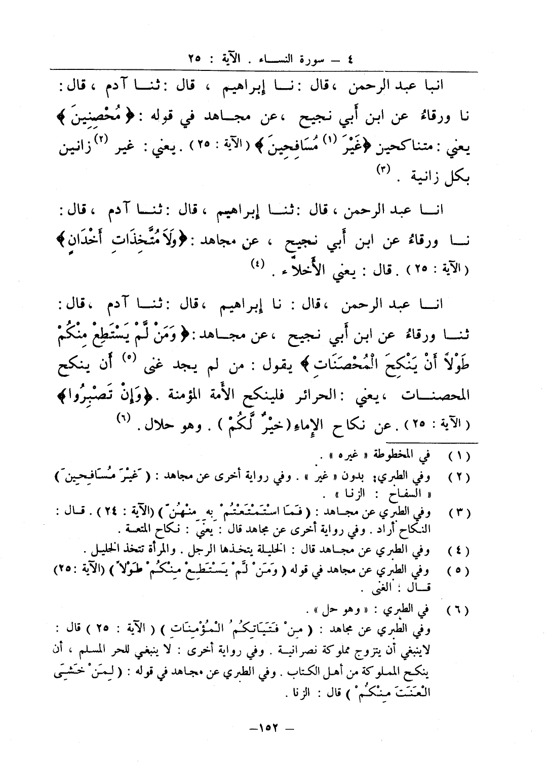 انبا عبد الرحمن قال نا إبراهيم قال ثنا آدم قال نا ورقاء عن ابن أبي نجيح عن مجاهد في قوله محصنين يعني متناكحين غير مسافحين يعني غير زانين بكل زانية