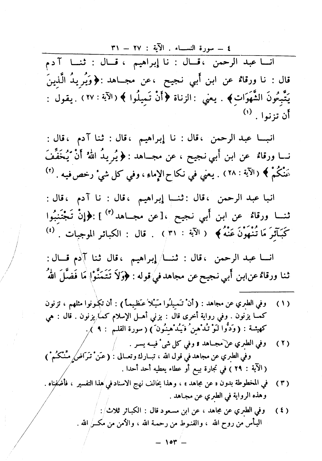 انا عبد الرحمن قال نا إبراهيم قال ثنا آدم قال نا ورقاء عن ابن أبي نجيح عن مجاهد ويريد الذين يتبعون الشهوات يعني الزناة أن تميلوا يقول أن تزنوا