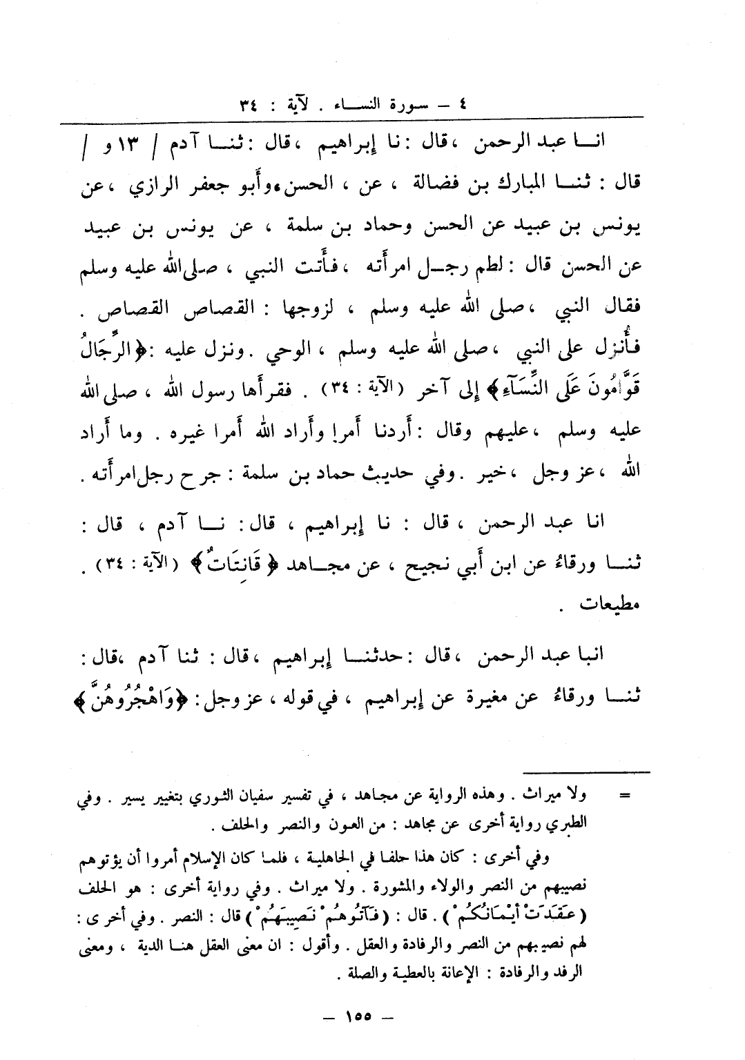 انا عبد الرحمن قال نا إبراهيم قال ثنا آدم قال ثنا المبارك بن فضالة عن الحسن وأبو جعفر الرازي عن يونس بن عبيد عن الحسن وحماد بن سلمة عن يونس بن عبيد عن الحسن قال لطم رجل امرأته فأتت النبي صلى الله عليه و سلم فقال النبي صلى الله عليه و سلم لزوجها القصاص القصاص فأنزل على النبي صلى الله عليه و سلم الوحي ونزل عليه الرجال قوامون على النسآء إلى آخر فقرأها رسول الله صلى الله عليه و سلم عليهم وقال أردنا أمرا وأراد الله أمرا غيره وما أراد الله عز و جل خير وفي حديث حماد بن سلمة جرح رجل امرأته