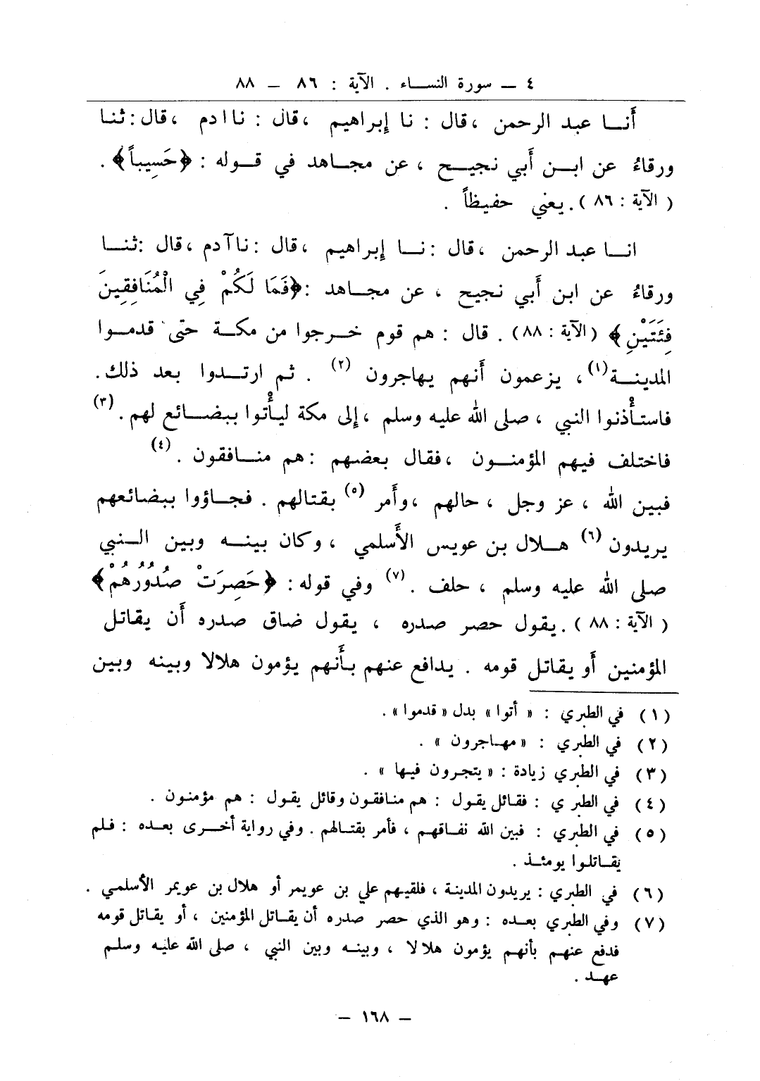 انا عبد الرحمن قال نا إبراهيم قال نا آدم قال ثنا ورقاء عن ابن ابي نجيح عن مجاهد فما لكم في المنافقين فئتين قال هم قوم خرجوا من مكة حتى قدموا المدينة يزعمون أنهم يهاجرون ثم ارتدوا بعد ذلك فاستأذنوا النبي صلى الله عليه و سلم إلى مكة ليأتوا ببضائع لهم فاختلف فيهم المؤمنون فقال بعضهم هم منافقون فبين الله عز و جل حالهم وأمر بقتالهم فجاؤوا ببضائعهم يريدون هلال بن عويس الأسلمي وكان بينه وبين النبي صلى الله عليه و سلم حلف وفي قوله حصرت صدورهم يقول حصر صدره يقول ضاق صدره أن يقاتل المؤمنين أو يقاتل قومه يدافع عنهم بأنهم يؤمون هلالا بينه وبين