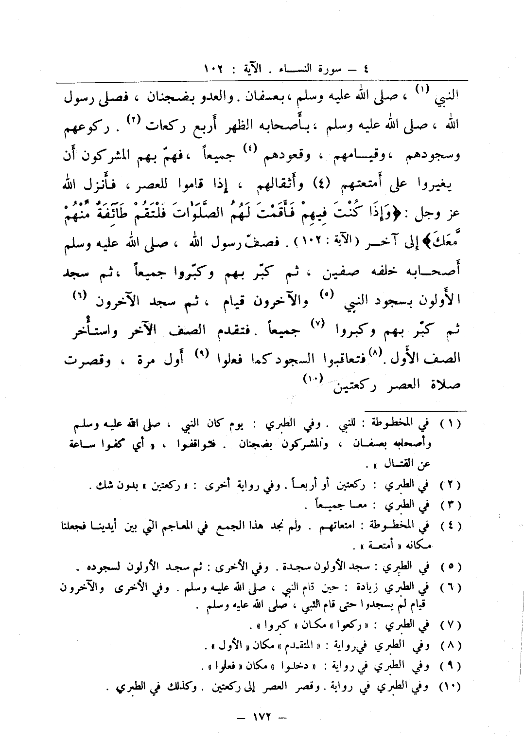 النبي صلى الله عليه و سلم بعسفان والعدو بضجنان فصلى رسول الله صلى الله عليه و سلم بأصحابه الظهر أربع ركعات ركوعهم وسجودهم وقيامهم وقعودهم جميعا فهم بهم المشركون أن يغيروا على أمتعتهم وأثقالهم إذا قاموا للعصر فأنزل الله عز و جل وإذا كنت فيهم فأقمت لهم الصلوات فلتقم طآئفة منهم معك إلى آخر فصف رسول الله صلى الله عليه و سلم أصحابه خلفه صفين ثم كبر بهم وكبروا جميعا ثم سجد الأولون بسجود النبي والآخرون قيام ثم سجد الآخرون ثم كبر بهم وكبروا جميعا فتقدم الصف الآخر واستأخر الصف الأول فتعاقبوا السجود كما فعلوا أول مرة وقصرت صلاة العصر ركعتين