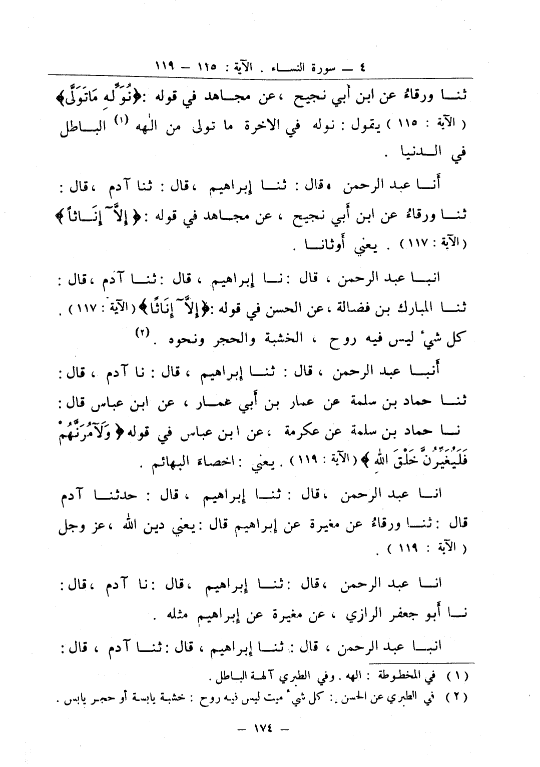 أنبا عبد الرحمن قال ثنا إبراهيم قال نا آدم قال ثنا حماد بن سلمة عن عمار بن أبي عمار عن ابن عباس قال نا حماد بن سلمة عن عكرمة عن ابن عباس في قوله ولآمرنهم فليغيرن خلق الله يعني اخصاء البهائم