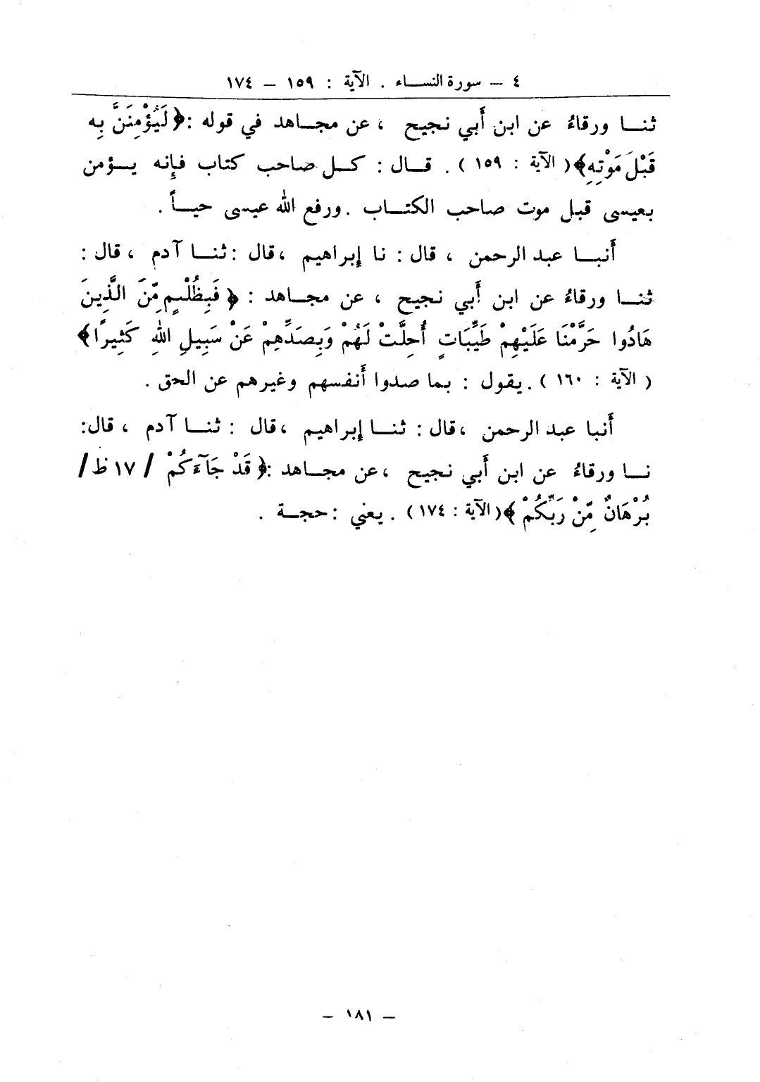 أنبا عبد الرحمن قال نا إبراهيم قال ثنا آدم قال ثنا ورقاء عن ابن أبي نجيح عن مجاهد فبظلم من الذين هادوا حرمنا عليهم طيبات أحلت لهم وبصدهم عن سبيل الله كثيرا يقول بما صدوا أنفسهم وغيرهم عن الحق
