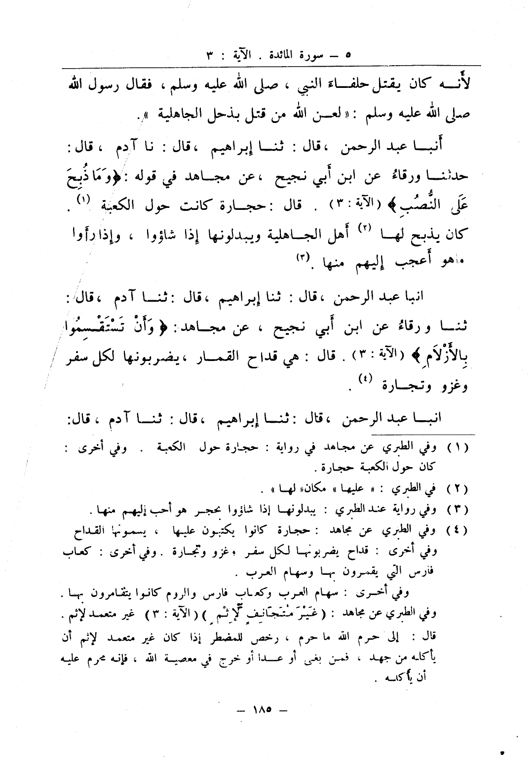 أنبا عبد الرحمن قال ثنا إبراهيم قال نا آدم قال حدثنا ورقاء عن ابن أبي نجيح عن مجاهد في قوله وما ذبح على النصب قال حجارة كانت حول الكعبة كان يذبح لها أهل الجاهلية ويبدلونها إذا شاؤوا وإذا رأوا ما هو أعجب إليهم منها