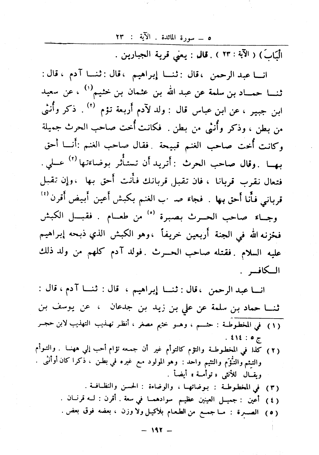 انا عبد الرحمن قال ثنا إبراهيم قال ثنا آدم قال ثنا حماد بن سلمة عن عبد الله بن عثمان بن خيثم عن سعيد ابن جبير عن ابن عباس قال ولد لآدم أربعة تؤم ذكر وأنثى من بطن وذكر وأنثى من بطن فكانت أخت صاحب الحرث جميلة وأخت صاحب الغنم قبيحة فقال صاحب الغنم أنا أحق بها وقال صاحب الحرث أتريد أن تستأثر بوضاءتها علي فتعال نقرب قربانا فإن تقبل قربانك فأنت أحق بها وإن تقبل قرباني فأنا أحق بها فجاء صاحب الغنم بكبش أعين أبيض أقرن وجاء صاحب الحرث بصبرة من طعام فقبل الكبش فخزنه الله في الجنة أربعين خريفا وهو الكبش الذي ذبحه إبراهيم عليه السلام فقتله صاحب الحرث فولد آدم كلهم من ولد ذلك الكافر