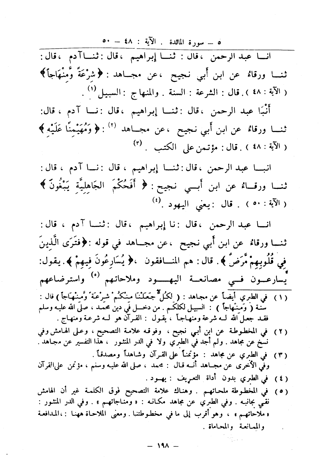 انا عبد الرحمن قال ثنا إبراهيم قال ثنا آدم قال ثنا ورقاء عن ابن أبي نجيح عن مجاهد شرعة ومنهاجا قال الشرعة السنة والمنهاج السبيل