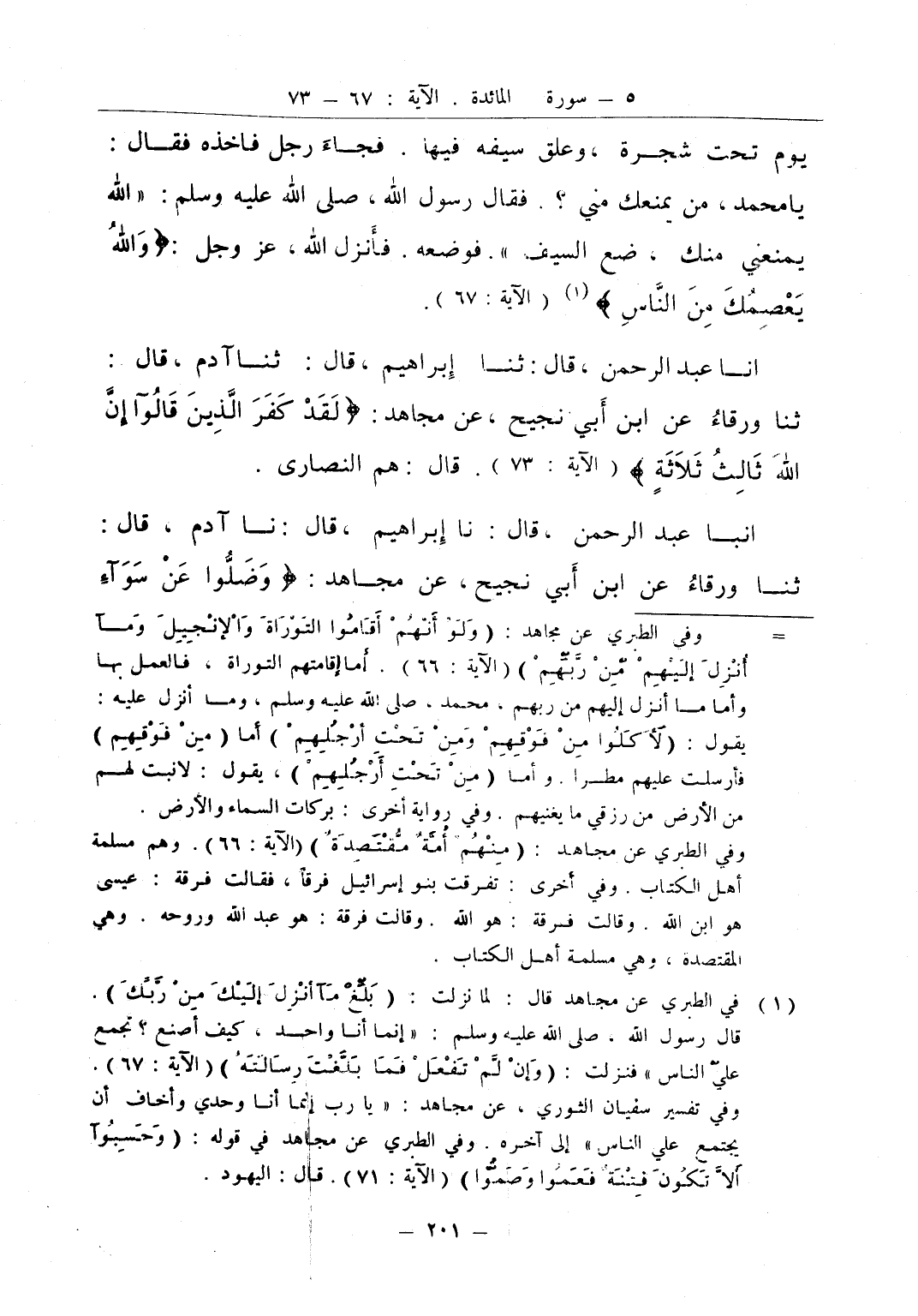 انا عبد الرحمن قال ثنا إبراهيم قال ثنا آدم قال ثنا ورقاء عن ابن أبي نجيح عن مجاهد لقد كفر الذين قالوآ إن الله ثالث ثلاثة قال هم النصارى