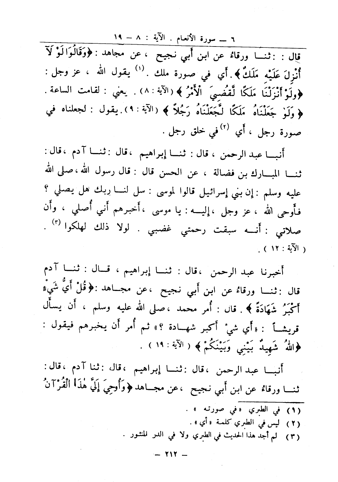 أنبا عبد الرحمن قال ثنا إبراهيم قال ثنا آدم قال ثنا ورقاء عن ابن أبي نجيح عن مجاهد وأوحي إلي هذا القرآن