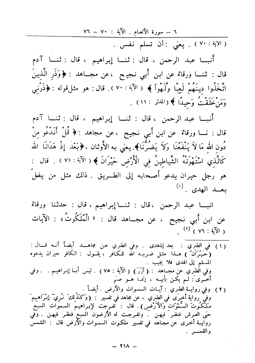 أنبا عبد الرحمن قال ثنا إبراهيم قال ثنا آدم قال نا ورقاء عن ابن أبي نجيح عن مجاهد قل أندعوا من دون الله ما لا ينفعنا ولا يضرنا يعني به الأوثان بعد إذ هدانا الله كالذي استهوته الشياطين في الأرض حيران قال هو رجل حيران يدعو أصحابه إلى الطريق ذلك مثل من يضل بعد الهدى