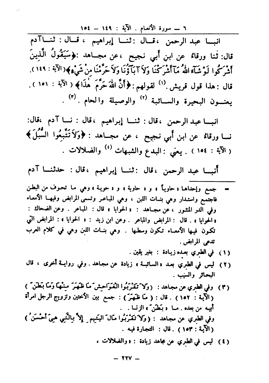 انبا عبد الرحمن قال ثنا إبراهيم قال ثنا آدم قال ثنا ورقاء عن ابن أي نجيح عن مجاهد سيقول الذين اشركوا لو شآء الله مآ اشركنا ولا آباؤنا ولا حرمنا من شيء قال هذا قول قريش لقولهم إن الله حرم هذا يعنون البحيرة والسائبة والوصيلة والحام