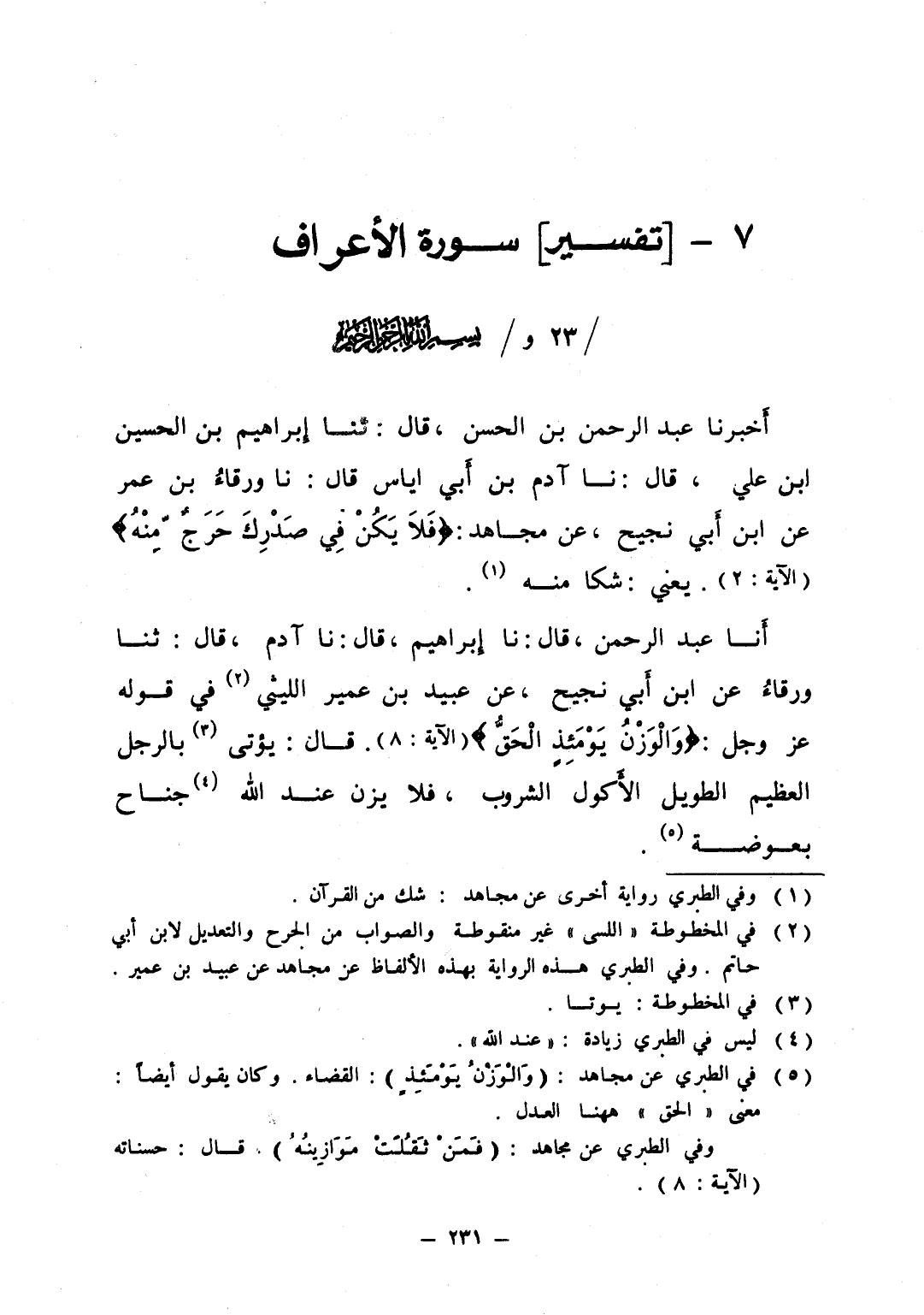 بسم الله الرحمن الرحيم أخبرنا عبد الرحمن بن الحسن قال ثنا إبراهيم بن الحسين ابن علي قال نا آدم بن أبي اياس قال نا ورقاء بن عمر عن ابن أبي نجيح عن مجاهد فلا يكن في صدرك حرج منه يعني شكا منه