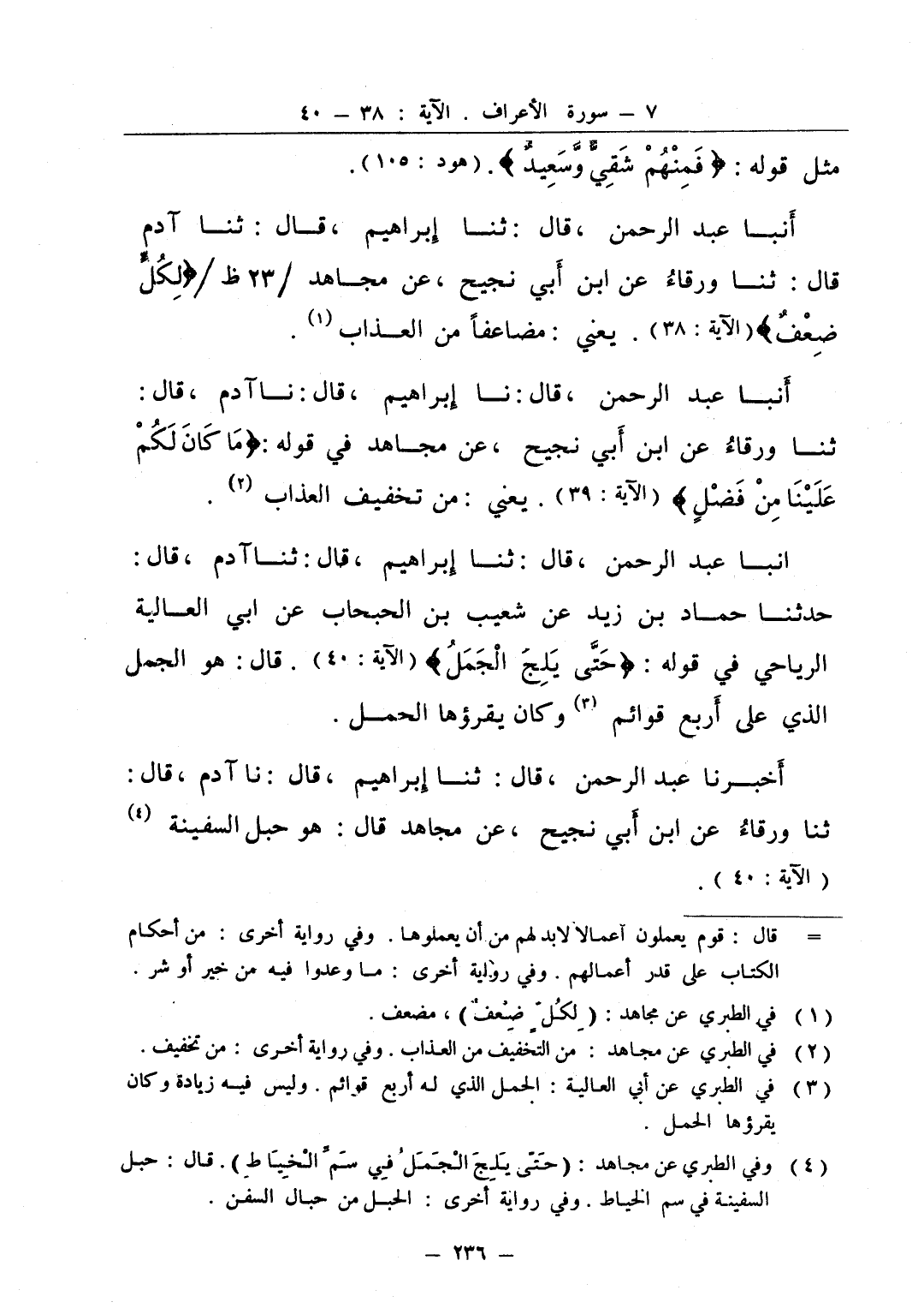 انبا عبد الرحمن قال ثنا إبراهيم قال ثنا آدم قال حدثنا حماد بن زيد عن شعيب بن الحبحاب عن أبي العالية الرياحي في قوله حتى يلج الجمل قال هو الجمل الذي على أربع قوائم وكان يقرؤها الحمل