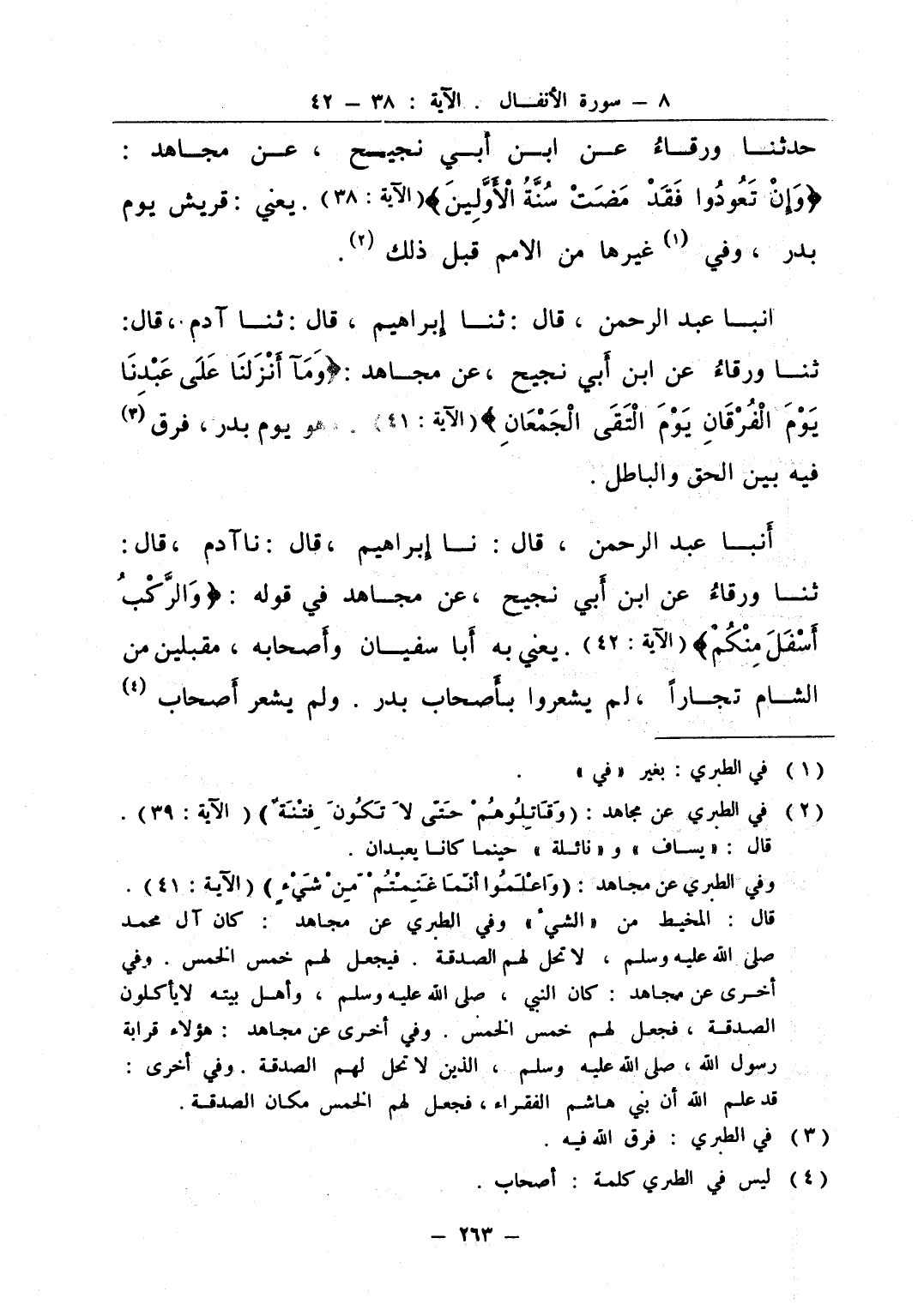 انبا عبد الرحمن قال ثنا إبراهيم قال ثنا آدم قال ثنا ورقاء عن ابن أبي نجيح عن مجاهد ومآ أنزلنا على عبدنا يوم الفرقان يوم التقى الجمعان هو يوم بدر فرق فيه بين الحق والباطل