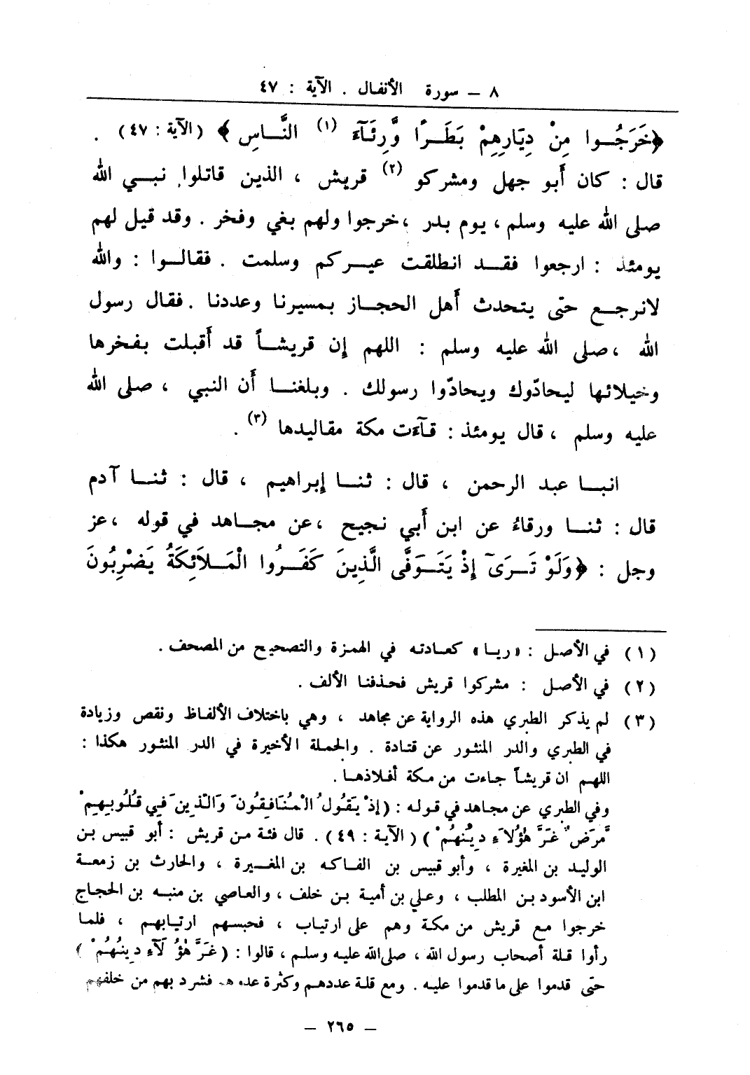 خرجوا من ديارهم بطرا ورئآء الناس قال كان أبو جهل ومشركوا قريش الذين قاتلوا نبي الله صلى الله عليه و سلم يوم بدر خرجوا ولهم بغي وفخر وقد قيل لهم يومئذ ارجعوا فقد انطلقت عيركم وسلمت فقالوا والله لا نرجع حتى يتحدث أهل الحجاز بمسيرنا وعددنا فقال رسول الله صلى الله عليه و سلم اللهم إن قريشا قد أقبلت بفخرها وخيلائها ليحادوك ويحادوا رسولك وبلغنا أن النبي صلى الله عليه و سلم قال يومئذ قآءت مكة مقاليدها