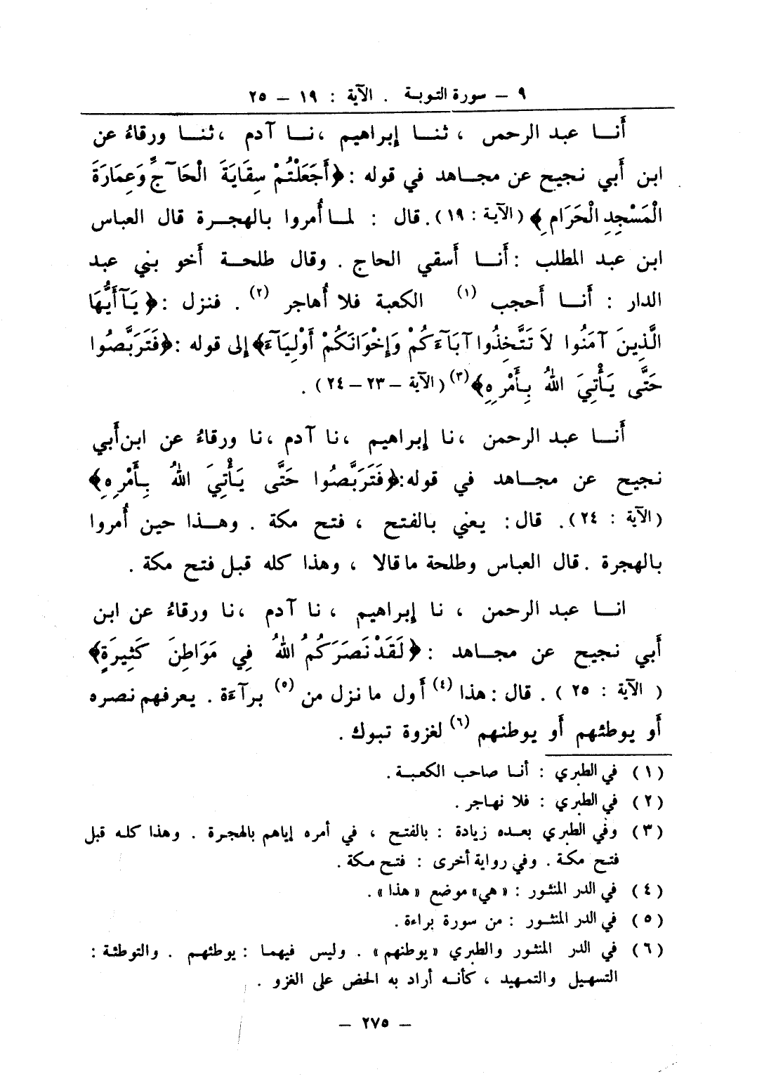 انا عبد الرحمن نا إبراهيم نا آدم نا ورقاء عن ابن أبي نجيح عن مجاهد لقد نصركم الله في مواطن كثيرة قال هذا أول ما نزل من براءة يعرفهم نصره أو يوطئهم أو يوطنهم لغزوة تبوك