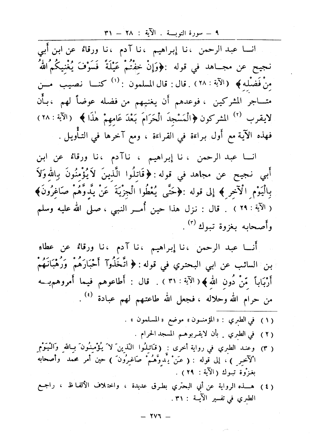 انا عبد الرحمن نا إبراهيم نا آدم نا ورقاء عن ابن أبي نجيح عن مجاهد في قوله وإن خفتم عيلة فسوف يغنيكم الله من فضله قال قال المسلمون كنا نصيب من متاجر المشركين فوعدهم أن يغنيهم من فضله عوضا لهم بأن لا يقرب المشركون المسجد الحرام بعد عامهم هذا فهذه الآية مع أول براءة في القراءة ومع آخرها في التأويل