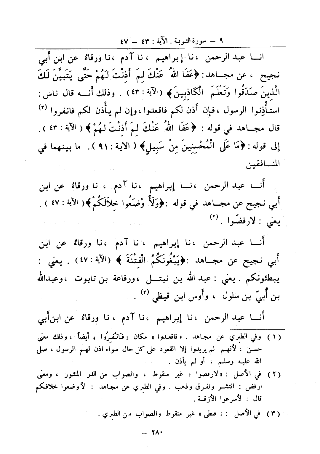 انا عبد الرحمن نا إبراهيم نا آدم نا ورقاء عن ابن أبي نجيح عن مجاهد يبغونكم الفتنة يعني يبطئونكم يعني عبد الله بن نبتل ورفاعة بن تابوت وعبد الله بن أبي بن سلول وأوس ابن قيظي