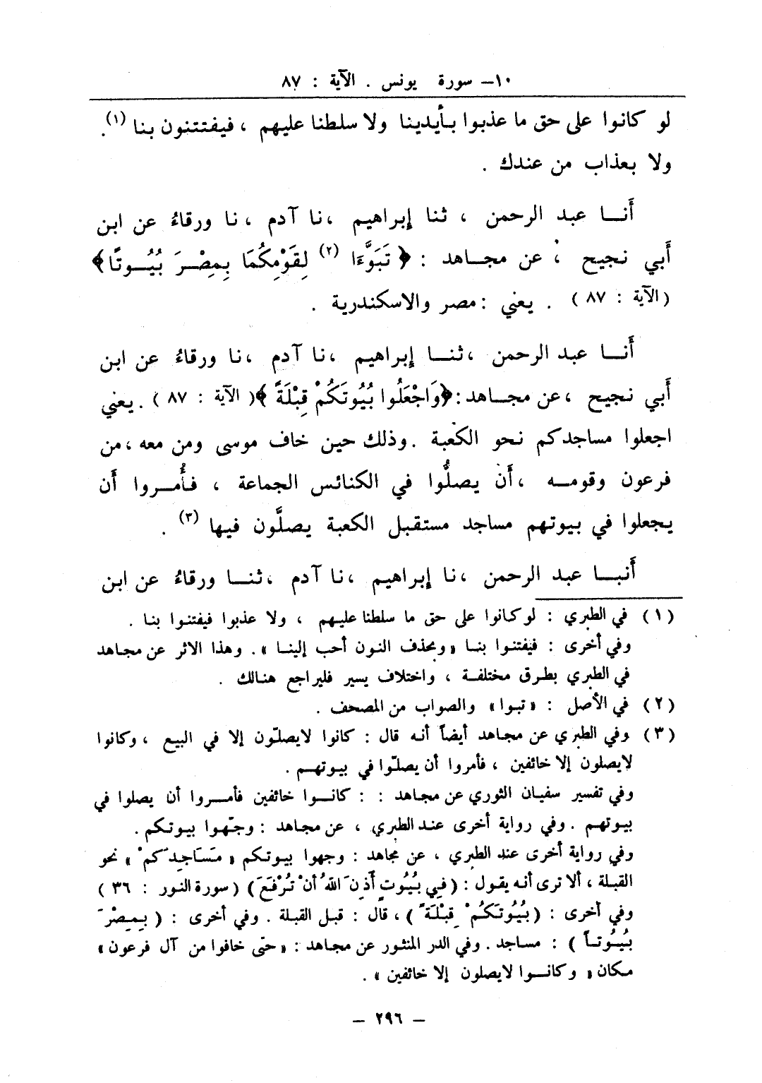 أنا عبد الرحمن ثنا إبراهيم نا آدم نا ورقاء عن ابن أبي نجيح عن مجاهد واجعلوا بيوتكم قبلة يعني اجعلوا مساجدكم نحو الكعبة وذلك حين خاف موسى ومن معه من فرعون وقومه أن يصلوا في الكنائس الجماعة فأمروا أن يجعلوا في بيوتهم مساجد مستقبل الكعبة يصلون فيها