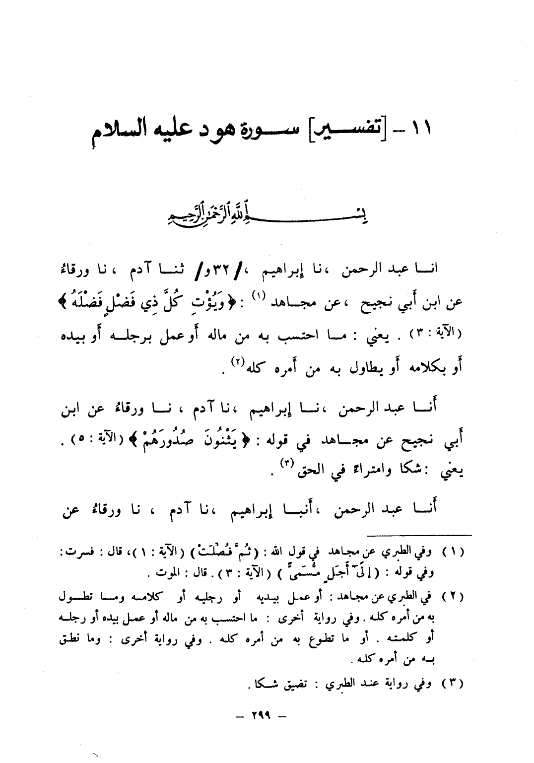 انا عبد الرحمن نا إبراهيم نا آدم نا ورقاء عن ابن ابي نجيح عن مجاهد في قوله يثنون صدورهم يعني شكا وامتراء في الحق