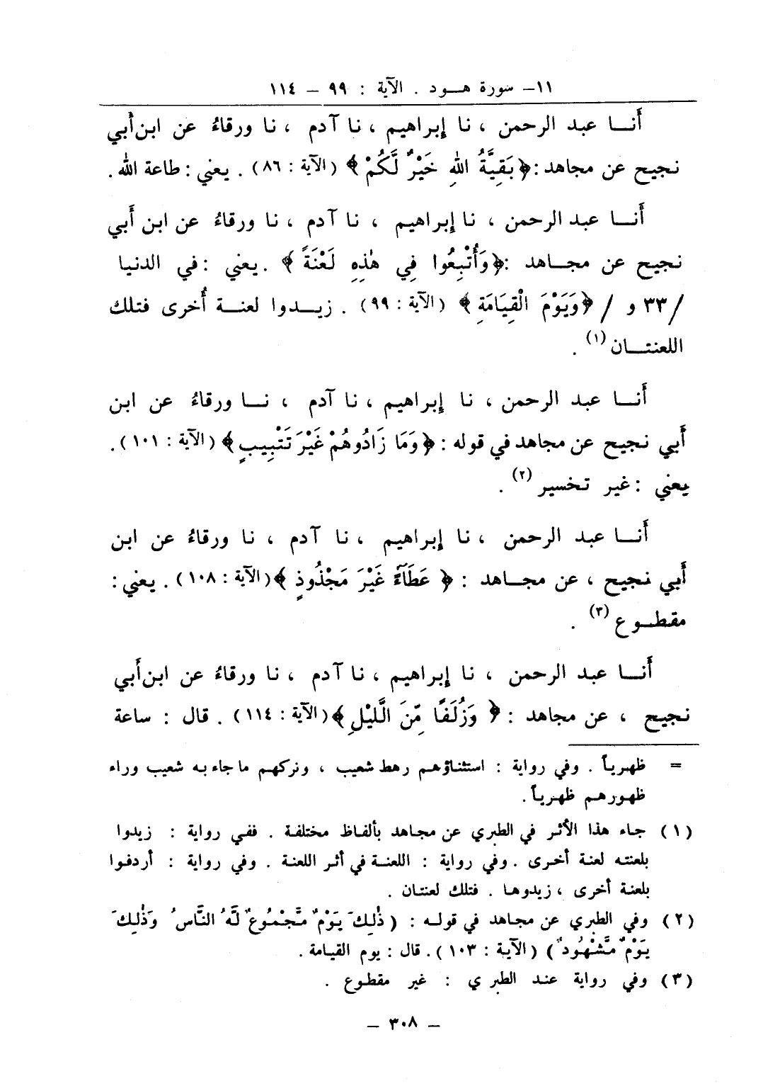 انا عبد الرحمن نا إبراهيم نا آدم نا ورقاء عن ابن ابي نجيح عن مجاهد وأتبعوا في هذه لعنة يعني في الدنيا ويوم القيامة زيدوا لعنة أخرى فتلك اللعنتان