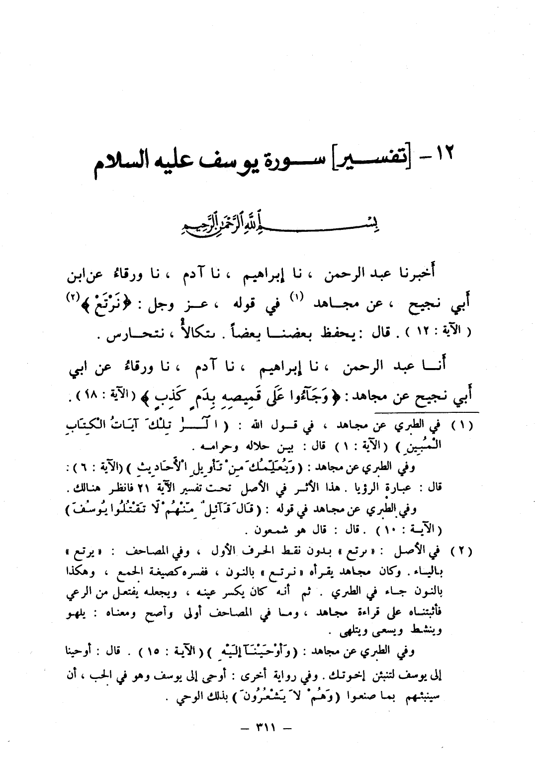 أخبرنا عبد الرحمن نا إبراهيم نا آدم نا ورقاء عن ابن أبي نجيح عن مجاهد في قوله عز و جل نرتع قال يحفظ بعضنا بعضا نتكالأ نتحارس