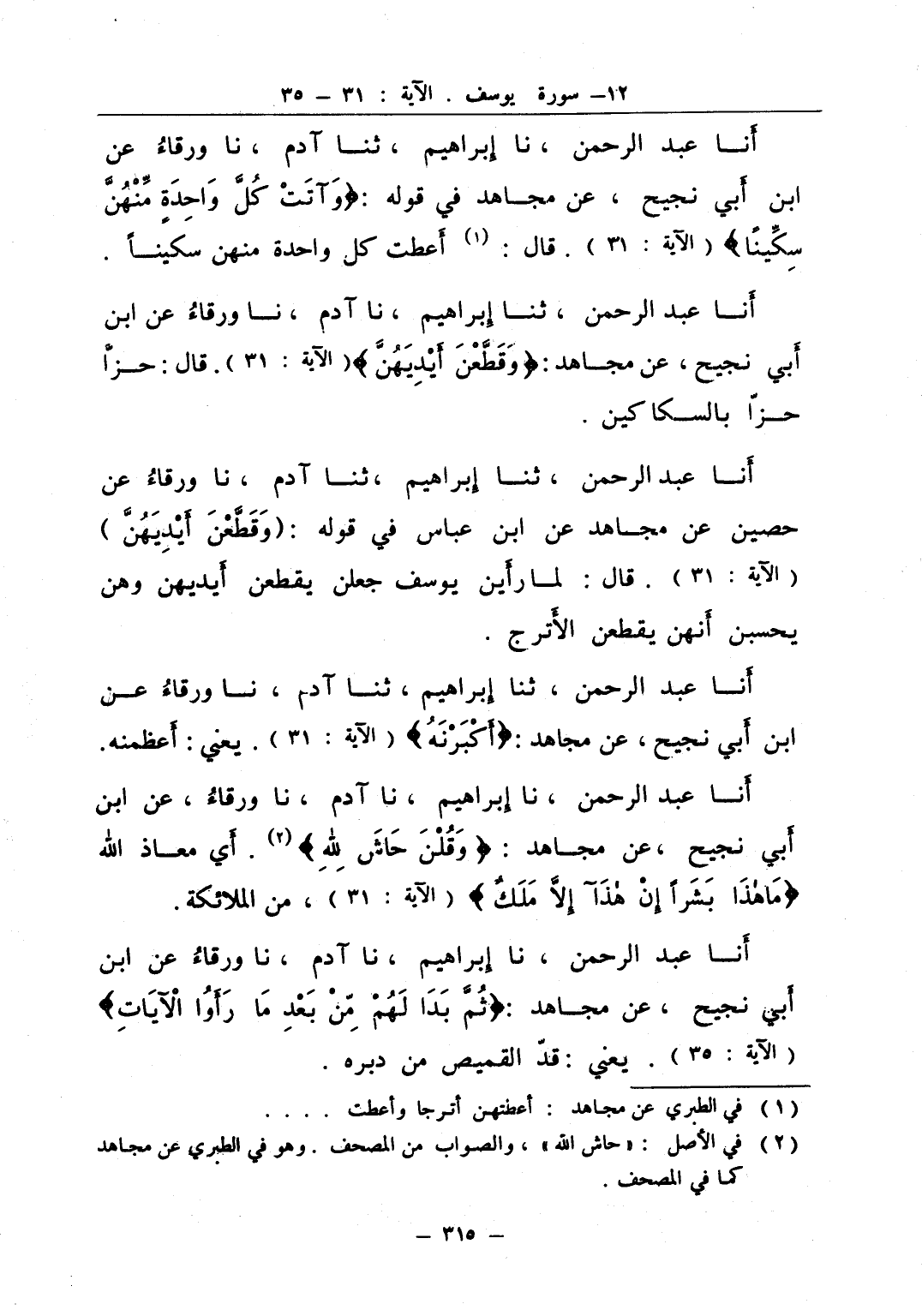 انا عبد الرحمن ثنا إبراهيم نا آدم نا ورقاء عن ابن أبي نجيح عن مجاهد وقطعن أيديهن قال حزا حزا بالسكاكين