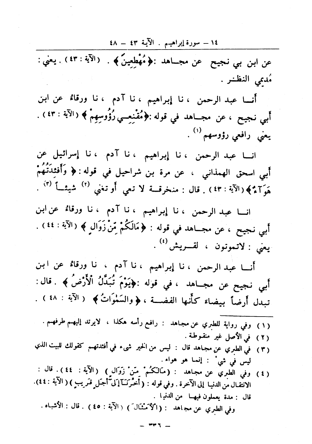 أنا عبد الرحمن نا إبراهيم نا آدم نا ورقاء عن ابن أبي نجيح عن مجاهد في قوله مقنعي رؤوسهم يعني رافعي رؤوسهم