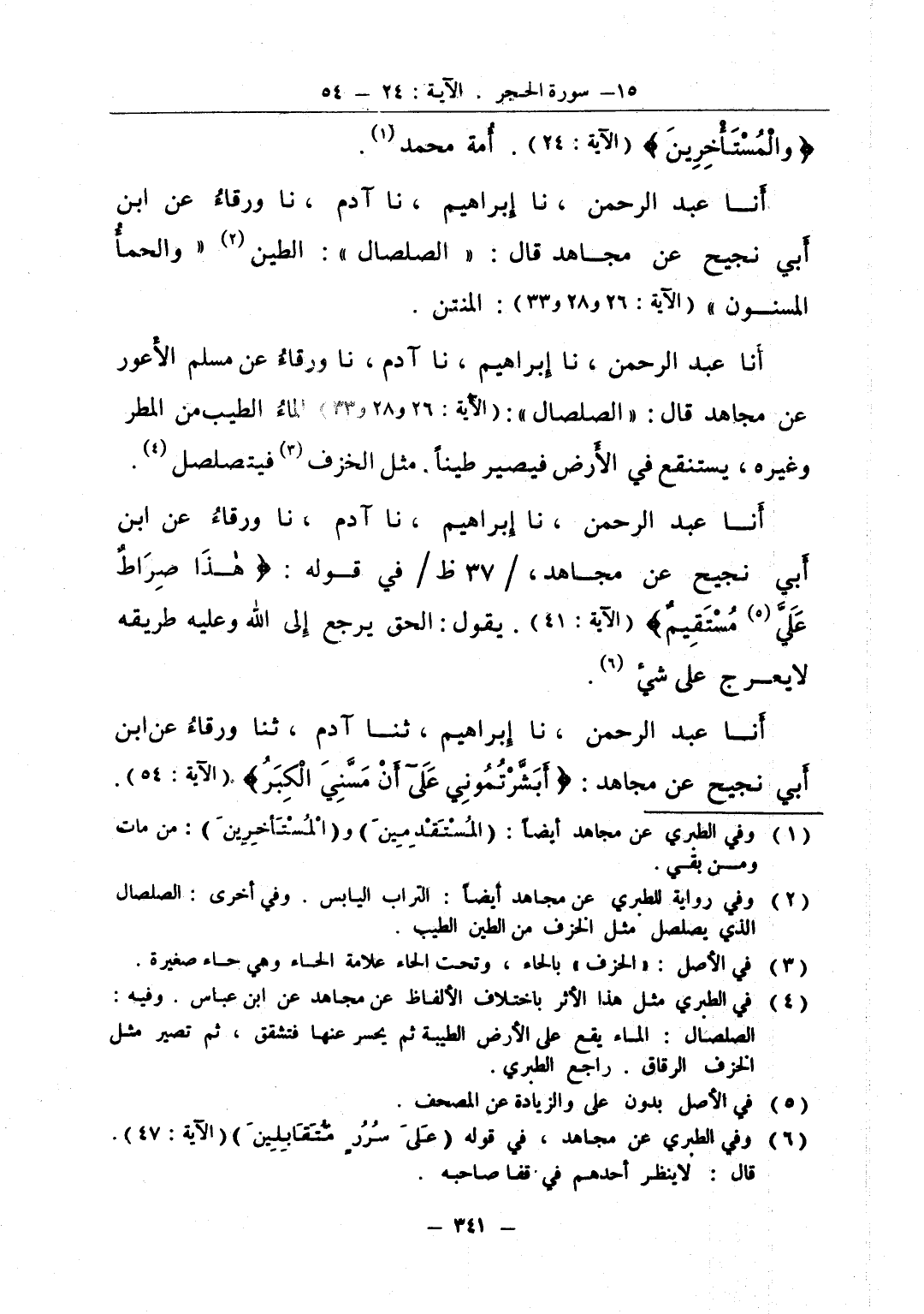 أنا عبد الرحمن نا إبراهيم نا آدم نا ورقاء عن ابن أبي نجيح عن مجاهد قال الصلصال الطين والحمأ المسنون المنتن
