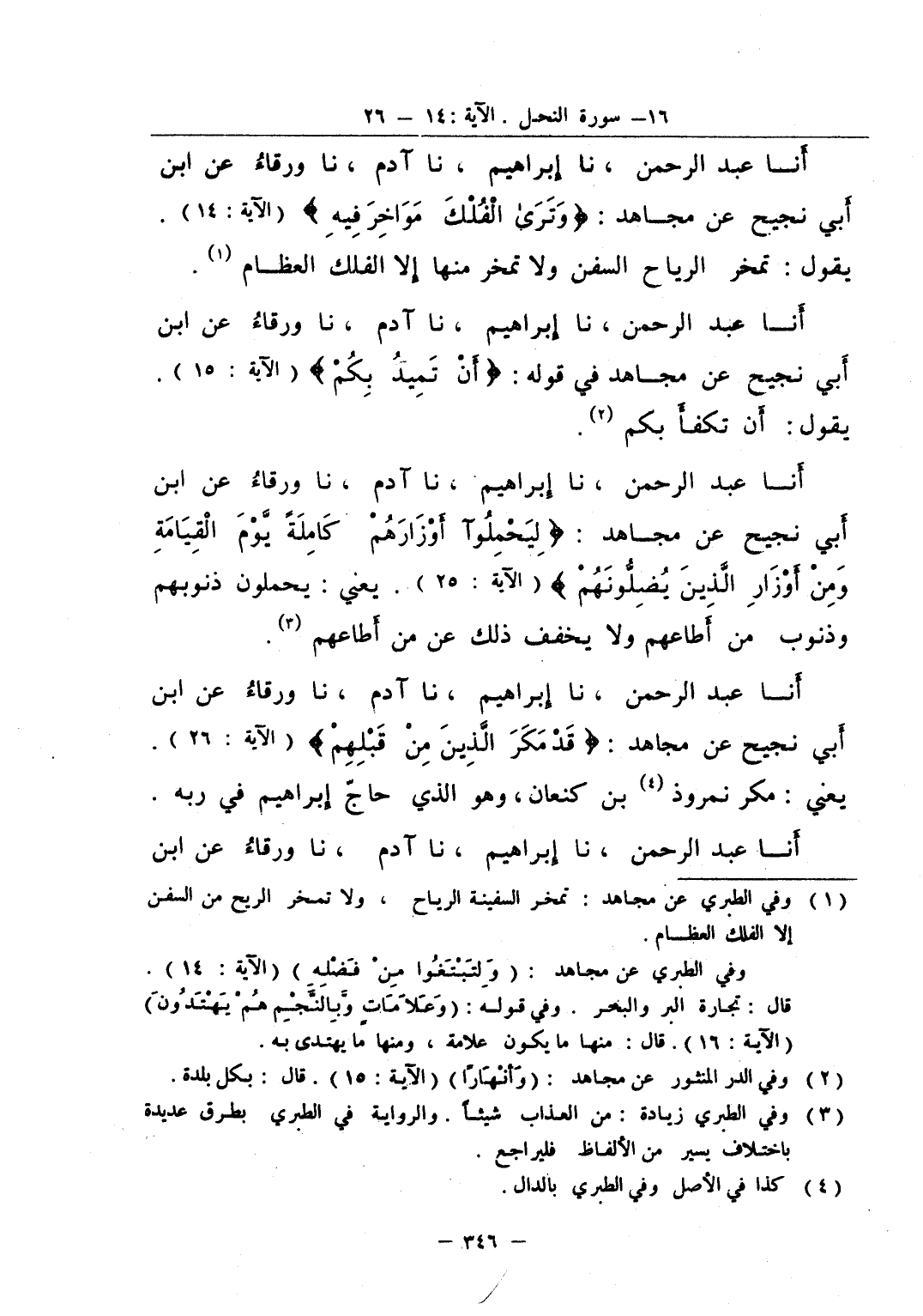 أنا عبد الرحمن نا إبراهيم نا آدم نا ورقاء عن ابن أبي نجيح عن مجاهد ليحملوا أوزارهم كاملة يوم القيامة ومن أوزار الذين يضلونهم يعني يحملون ذنوبهم وذنوب من أطاعهم ولا يخفف ذلك عن من أطاعهم