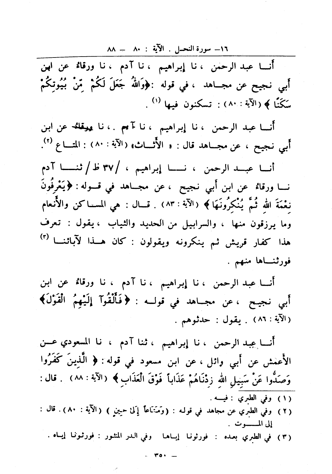 أنا عبد الرحمن نا إبراهيم ثنا آدم نا ورقاء عن ابن أبي نجيح عن مجاهد في قوله يعرفون نعمة الله ثم ينكرونها قال هي المساكن والأنعام وما يرزقون منها والسرابيل من الحديد والثياب يقول يعرف هذا كفار قريش ثم ينكرونه ويقولون كان هذا لآبائنا فورثناها منهم