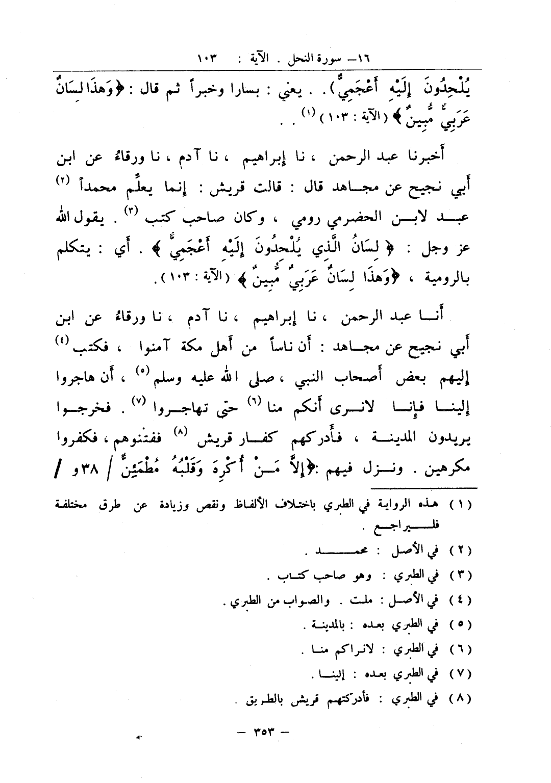 أخبرنا عبد الرحمن نا إبراهيم نا آدم نا ورقاء عن ابن أبي نجيح عن مجاهد قال قالت قريش إنما يعلم محمدا عبد لابن الحضرمي رومي وكان صاحب كتب يقول الله عز و جل لسان الذي يلحدون إليه أعجمي أي يتكلم بالرومية وهذا لسان عربي مبين