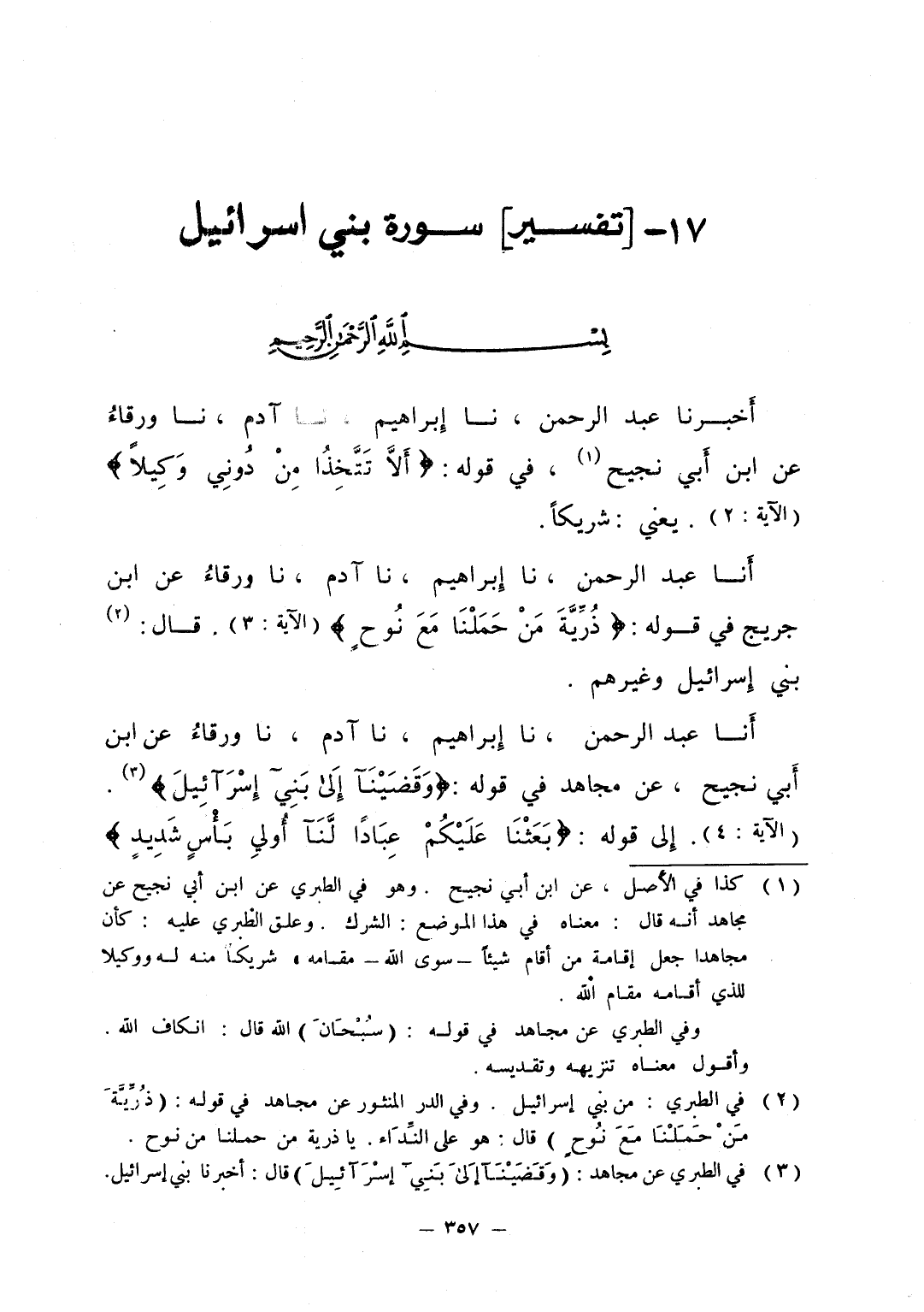 أنا عبد الرحمن نا إبراهيم نا آدم نا ورقاء عن ابن أبي نجيح عن مجاهد في قوله وقضينآ إلى بني إسرائيل إلى قوله بعثنا عليكم عبادا لنآ أولي بأس شديد