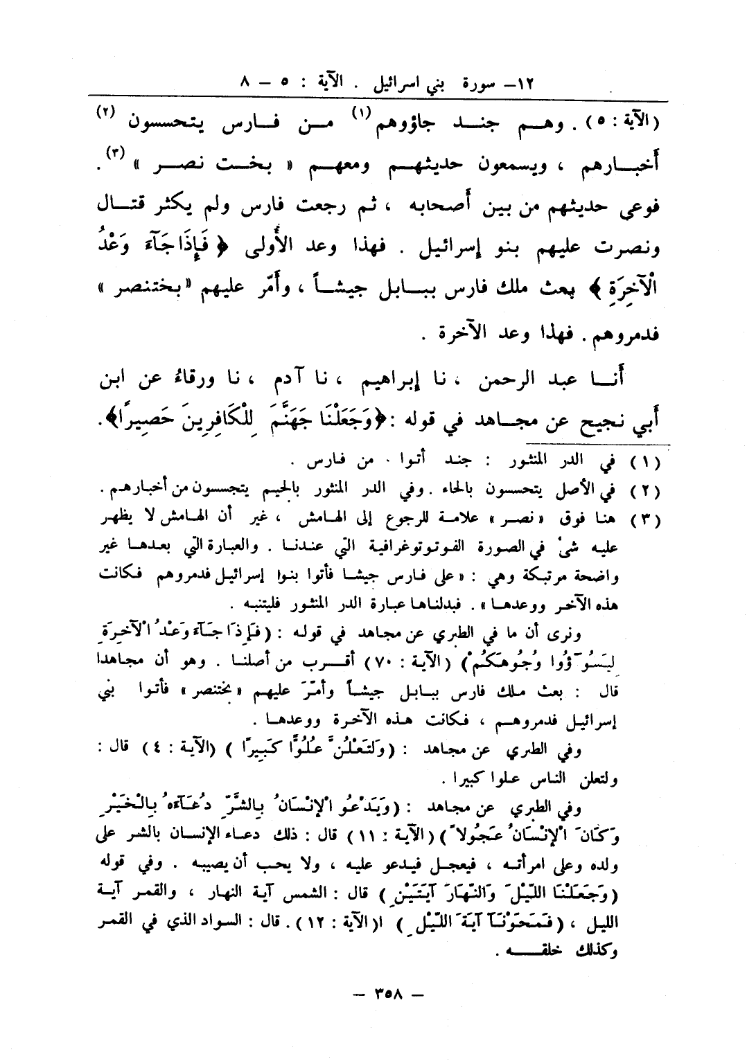 وهم جند جاؤوهم من فارس يتحسسون أخبارهم ويسمعون حديثهم ومعهم بخت نصر فوعى حديثهم من بين أصحابه ثم رجعت فارس ولم يكثر قتال ونصرت عليهم بنو إسرائيل فهذا وعد الأولى فإذا جآء وعد الآخرة بعث ملك فارس ببابل جيشا وأمر عليهم بختنصر فدمروهم فهذا وعد الآخرة