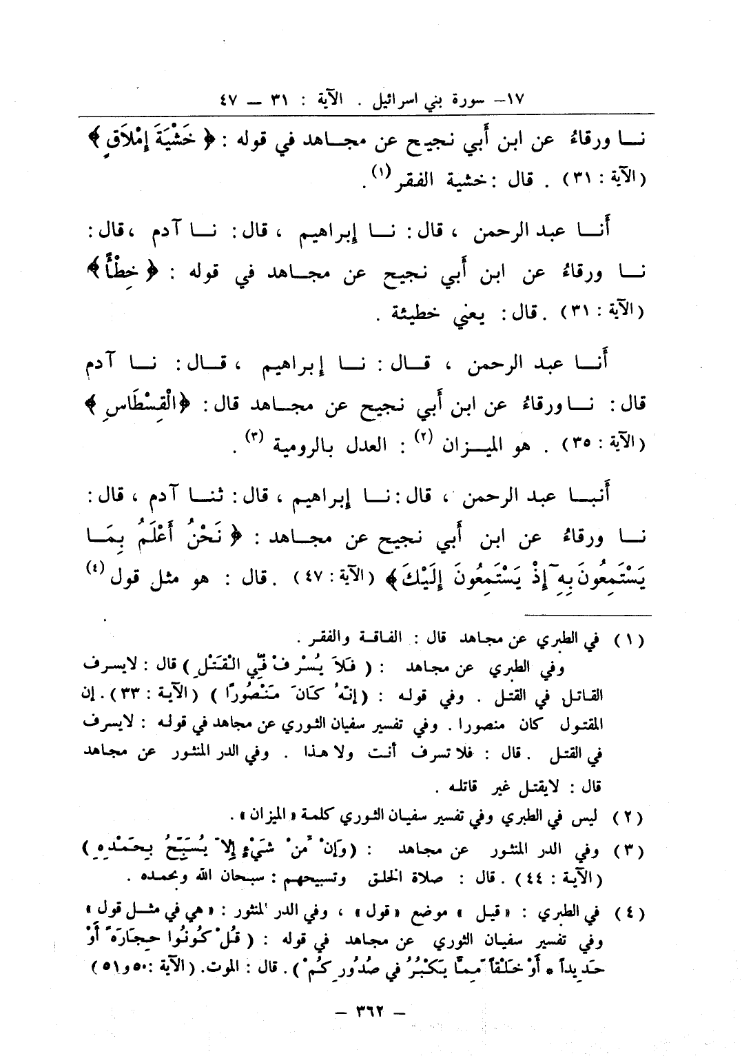 أنا عبد الرحمن قال نا ابراهيم قال نا آدم قال نا ورقاء عن ابن أبي نجيح4 عن مجاهد في قوله خطأ قال يعني خطيئة أنا عبد الرحمن قال نا إبراهيم قال نا آدم قال نا ورقاء عن ابن أبي نجيح عن مجاهد قال القسطاس هو الميزان العدل بالرومية أنبا عبد الرحمن قال نا إبراهيم قال ثنا آدم قال نا ورقاء عن ابن أبي نجيح عن مجاهد نحن أعلم بما يستمعون به إذ يستمعون إليك قال هو مثل قول